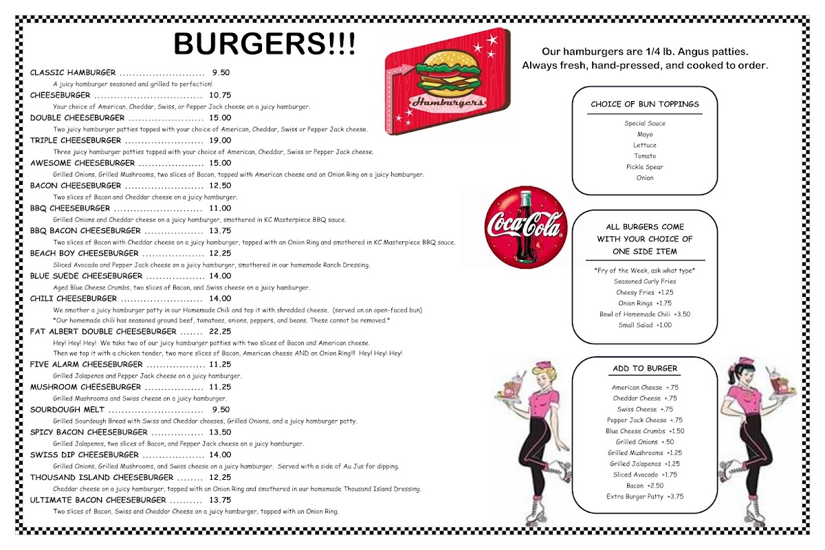 Grilled jalapenos, bacon, and Pepper Jack cheese on our juicy, hand pressed fresh Angus burger patty. Served on a bun with one side item.