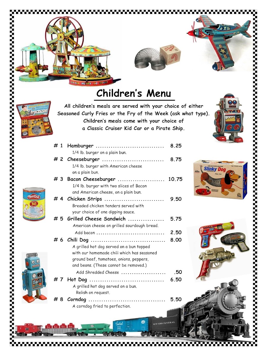 1/4 lb burger on a bun. Served with one side item. All children's meals come with your choice of a Classic Cruiser Kid's Meal Car (random car/color), Pirate Ship, or Activity Kit (random).