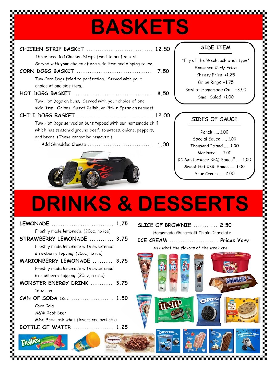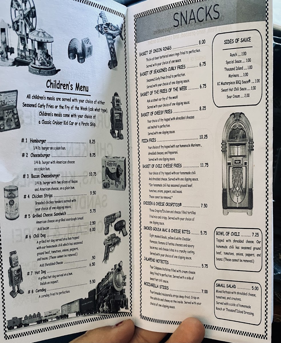 Homemade chili on a hotdog & bun. Served with your choice of one side item. All children's meals come with your choice of a Classic Cruiser Kid's Meal Car (random car/color), Pirate Ship, or Activity Kit (random). *Our homemade chili has seasoned ground beef, tomatoes, onions, peppers, and beans. These can not be removed.*