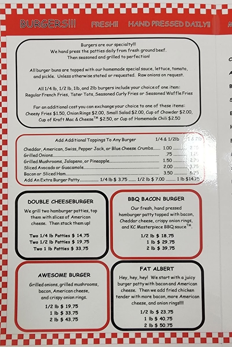 We grill two of our hand pressed, fresh Angus 1/4 lb hamburger patties (for a total of 1/2 lb) and top them your choice of cheese. Then stack them up! Served on a bun with one side item.